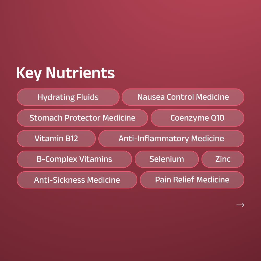 The Ultimate Hangover Recovery Drip™ is a premium IV therapy designed to support full recovery after alcohol-related dehydration and stress. It helps turn common hangover symptoms such as headache, nausea, brain fog, weakness, and dehydration into a smoother, more comfortable comeback.