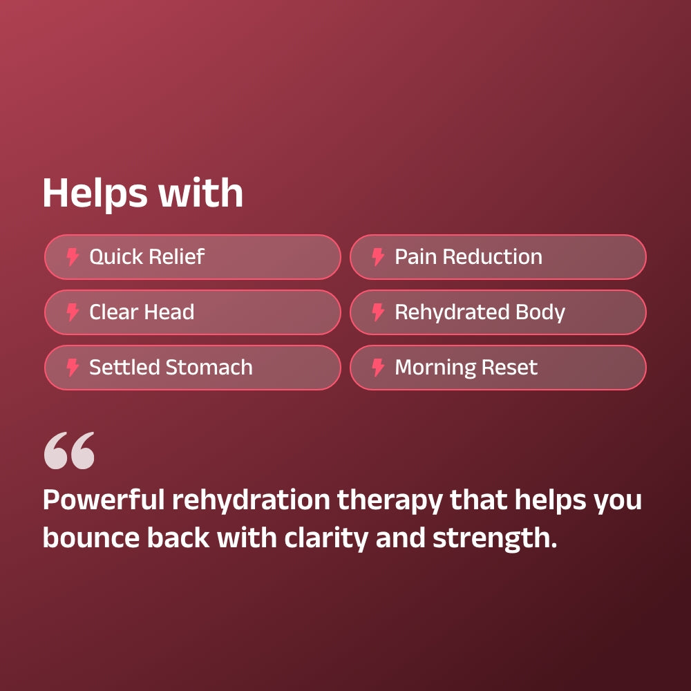 Best For: hangover recovery, dehydration, headache, nausea, brain fog, post-party fatigue.
