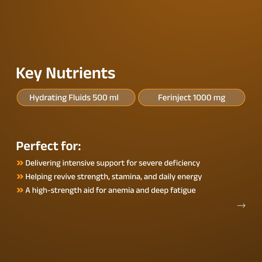 This drip is specifically created for clients who already know that iron is what their body needs, whether due to diagnosed iron deficiency, low ferritin levels, anemia, or ongoing iron depletion. It offers multiple variants to match different degrees of deficiency, ranging from gentle replenishment to advanced iron repletion. Lower variants are suitable for mild deficiency or maintenance support, while higher variants provide deeper correction for moderate to severe iron depletion or chronic anemia.