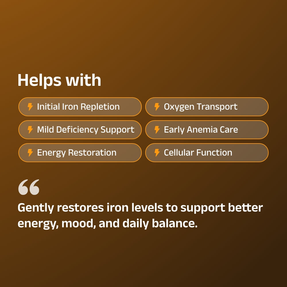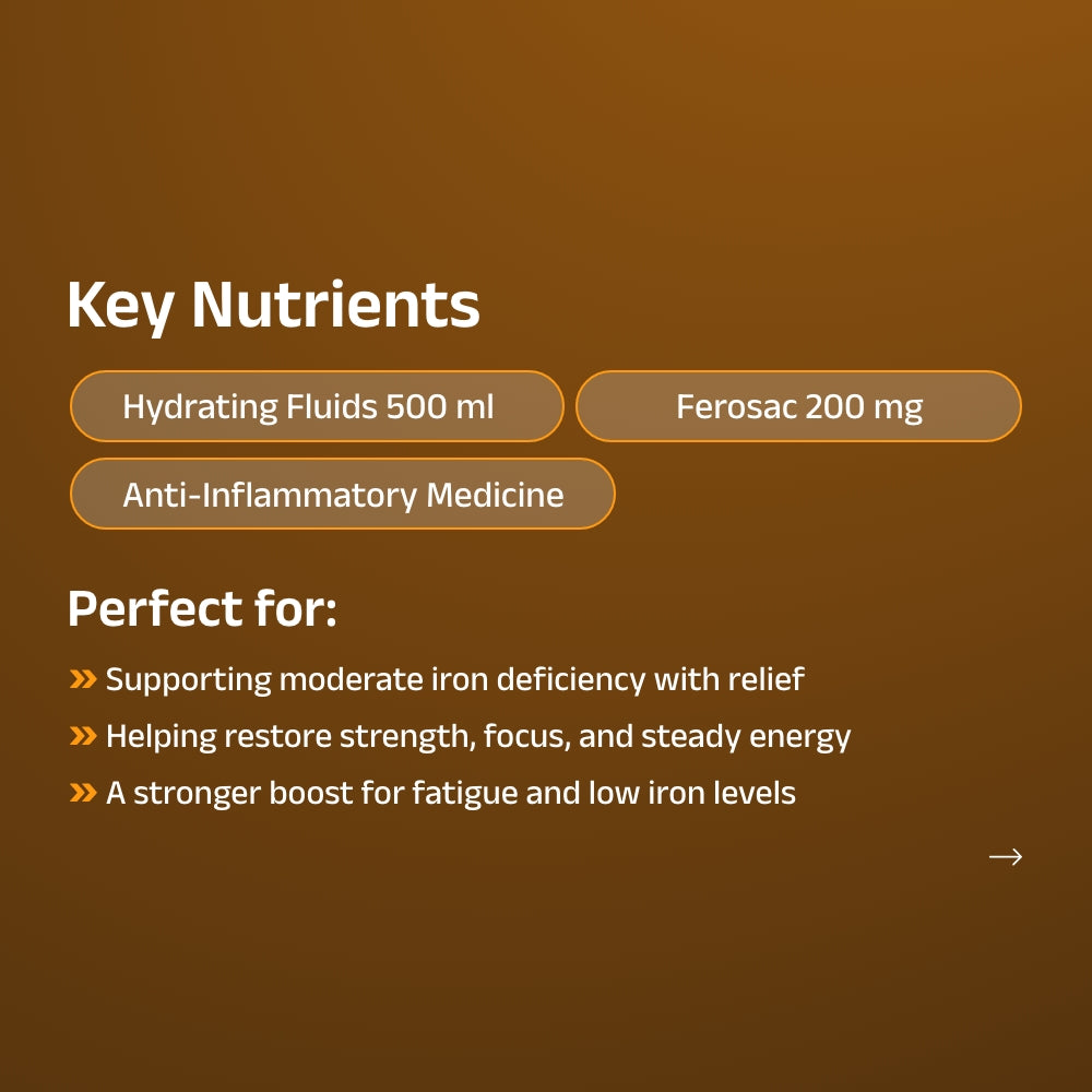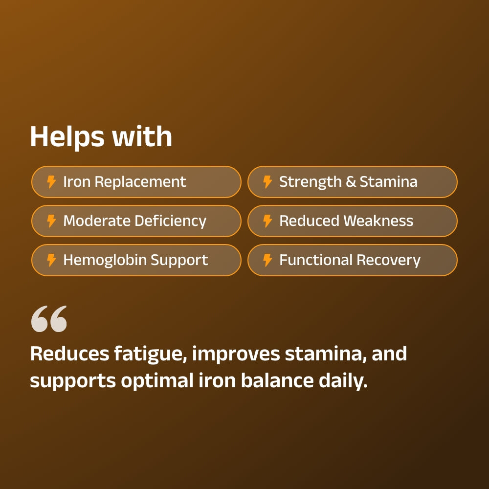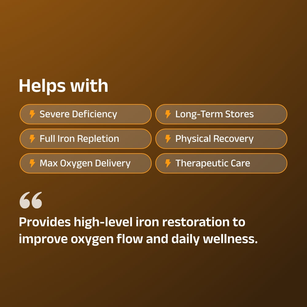 Best For: iron deficiency anemia, chronic fatigue, low ferritin levels, low stamina, frequent dizziness, shortness of breath, postpartum iron depletion, heavy menstrual blood loss, and individuals with poor tolerance or response to oral iron.
