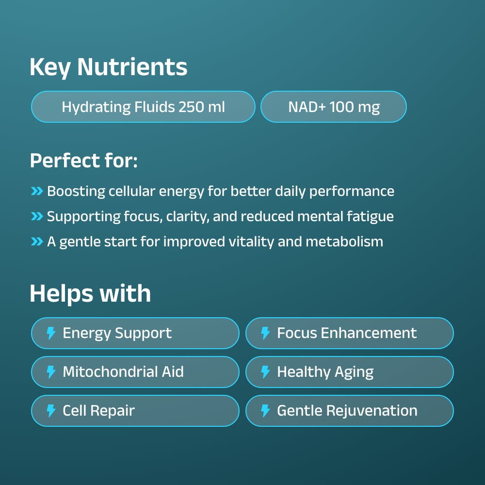 Best For: chronic fatigue, burnout, brain fog, mental exhaustion, high-stress professionals, frequent travelers, and individuals seeking anti-aging and cellular wellness support.